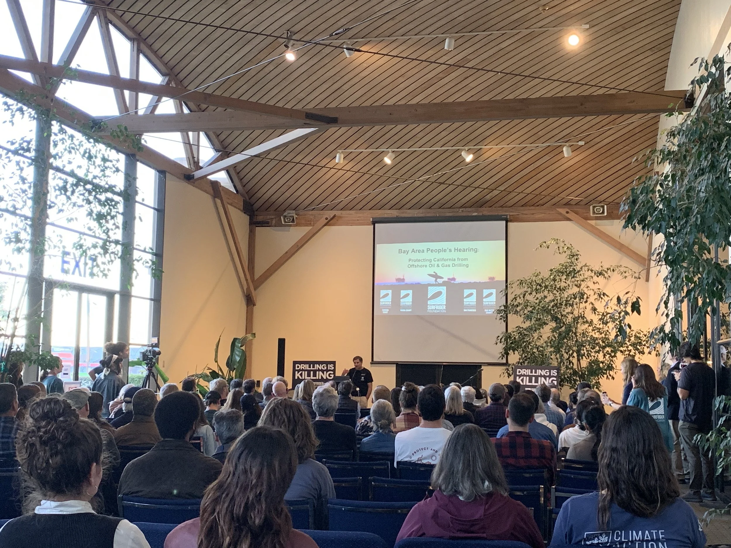 Attendees at the Bay Area People’s Hearing listen to a presentation about drilling impacts from Surfrider Foundation. EAC joined others in encouraging the audience to submit comments opposing expanded offshore oil drilling.
