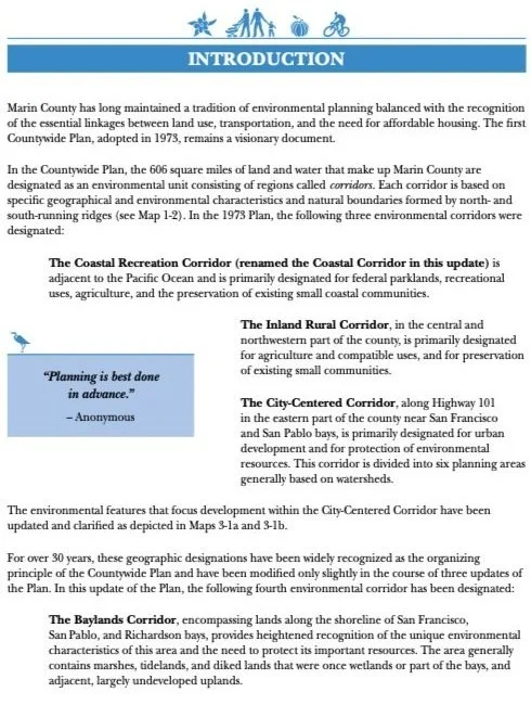 The current 2007 Countywide Plan, includes four environmental corridors, including: 1) Coastal Corridor; 2) Inland Rural Corridor; 3) City-Centered Corridor; and 4) Baylands Corridor that define community development guidelines.